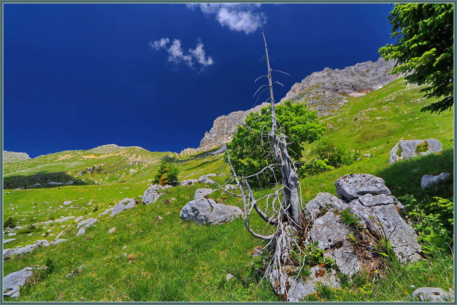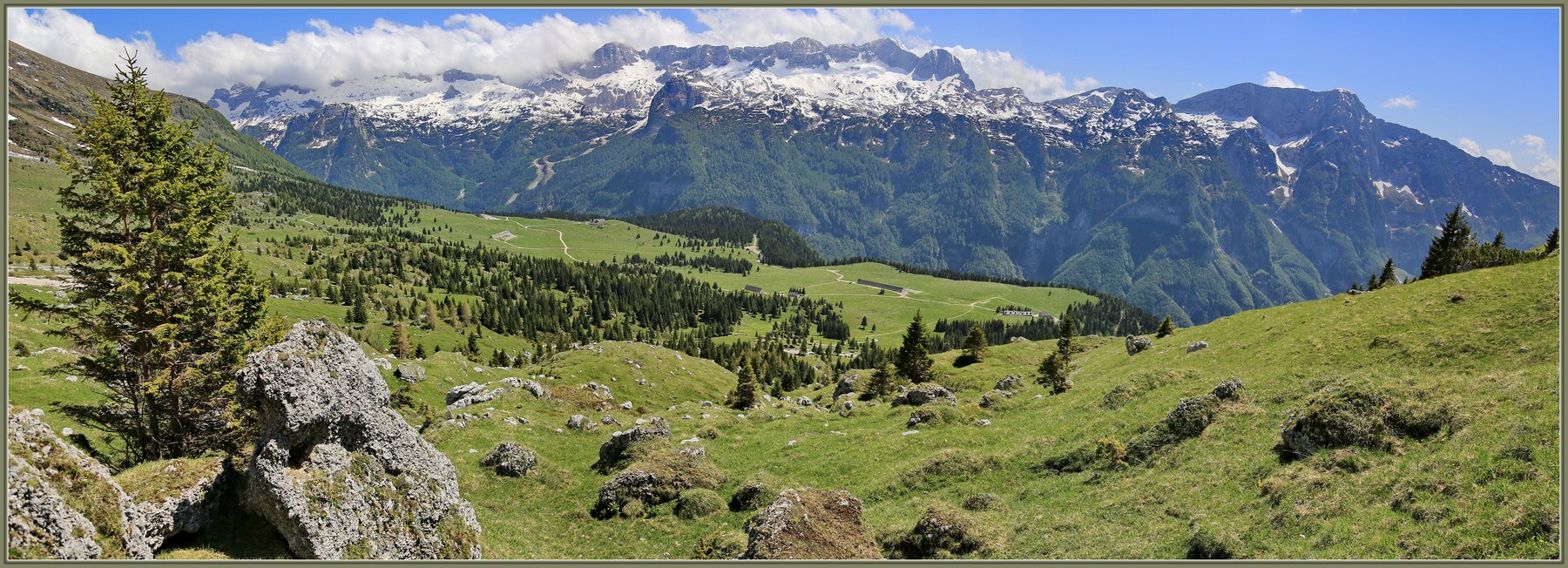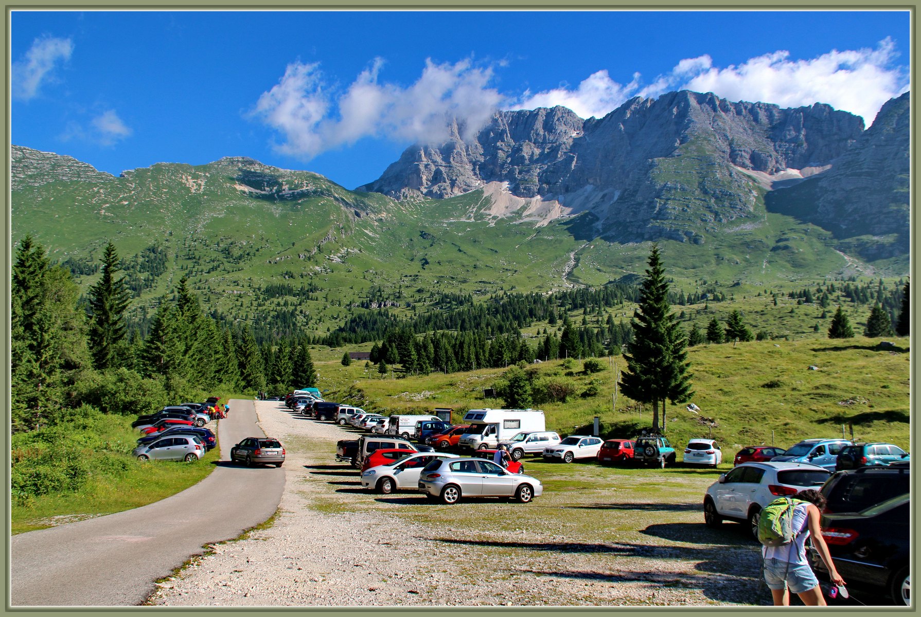 Nahajamo se na parkirišču, na višini okoli 1550 m. n. v. Tu mnogokrat ne prešteješ avtomobilov s slovenskimi tablicami. Pred nami se razteza Planina Pecol in nad njo mogočno pogorje Špika nad Policami – Montaža – 2752 m. n. v.