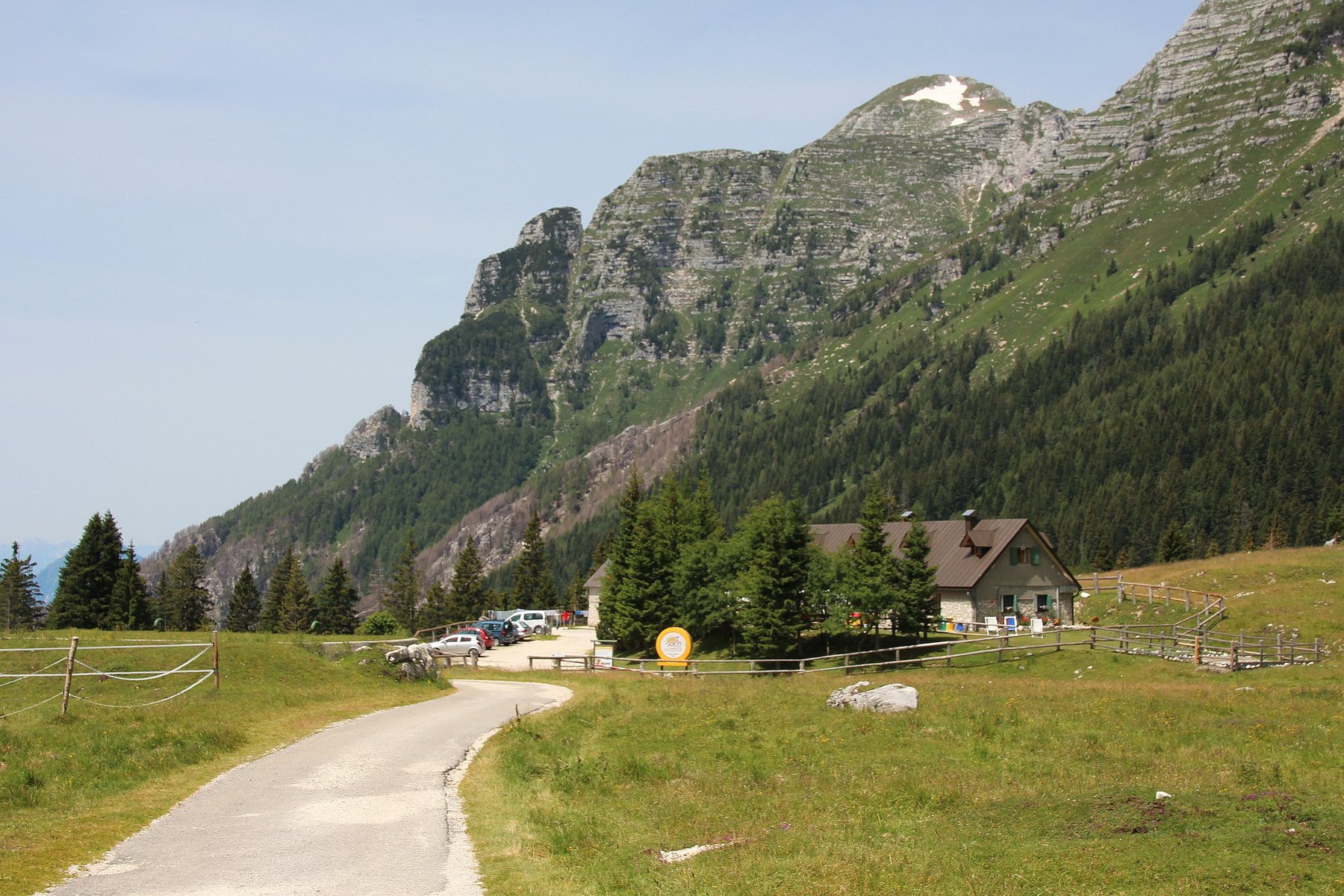 Vrnemo se na cesto, ki vodi na sedlo V Žlebeh – Sella Nevea. Tako lepa je ta pot, ki vodi po severni strani jezera. Kmalu smo na sedlu, ki so mu namerili 1190 metrov nad morjem (slika 3). Od tu pelje gondola za kombinirano smučišče Kanin. Ko se cesta v pravokotnem ovinku usmeri levo v naselje, bodimo pozorni. Tu mi zavijemo desno in se po oznaki za Planino Pecol – Alt. del Montasio zapeljemo po 6 km dolgi asfaltni cesti. Ta se na začetku strmo dviga. Kmalu pred seboj uzremo čudovit prizor (slika 4 – parkirišče). Nahajamo se na parkirišču, na višini okoli 1550 m. n. v. Tu mnogokrat ne prešteješ avtomobilov s slovenskimi tablicami. Pred nami se razteza Planina Pecol in nad njo mogočno pogorje Špika nad Policami – Montaža – 2752 m. n. v. Tako lepega prizora ne doživimo vsak dan ali pa vsaj ne pogosto. Če ste vezani na voziček, je tu izjemna lokacija, da uživate v pravih hribih.