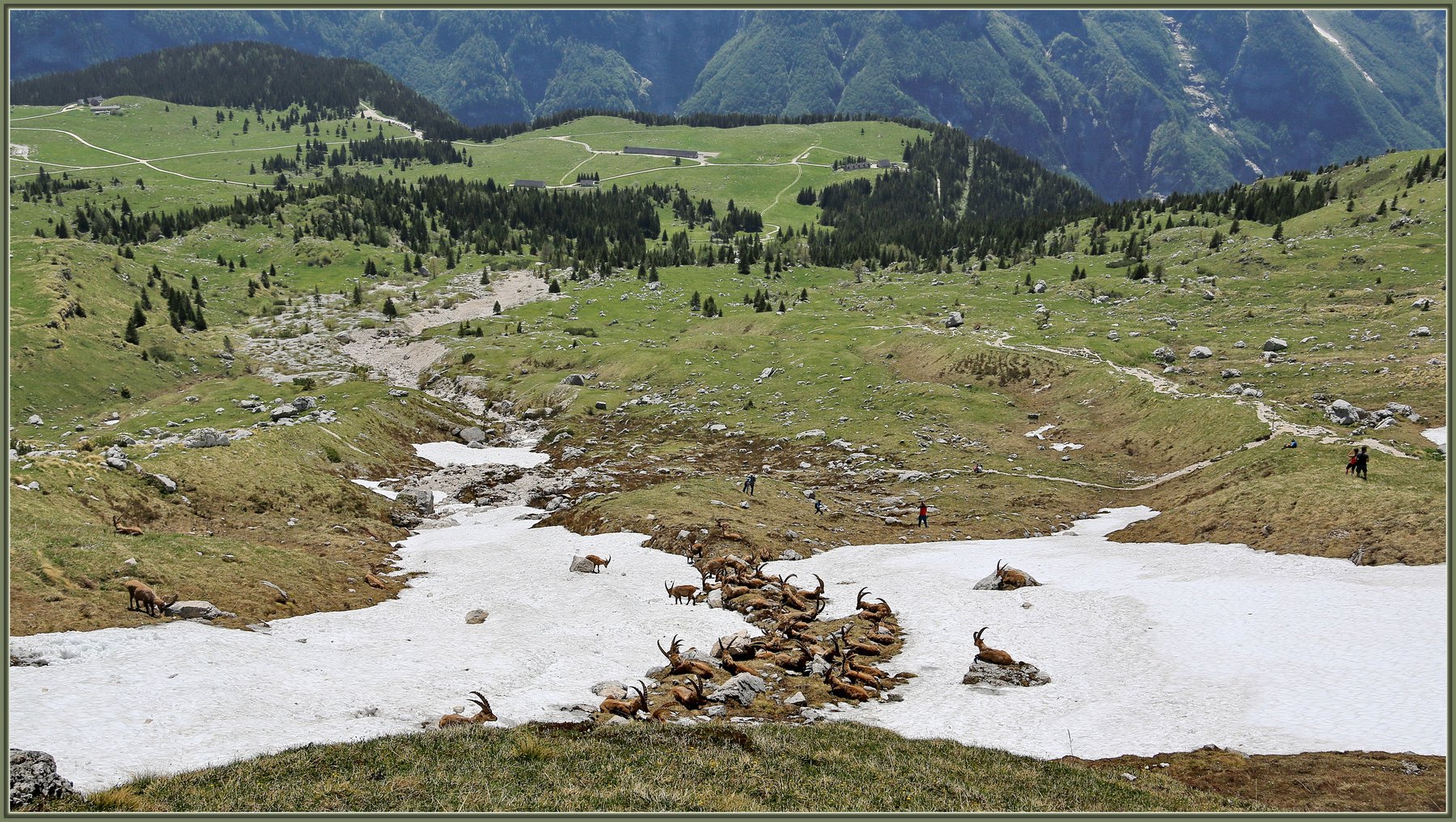 Orientacija nam ne bo delal problemov, saj vse od parkirišča, planine pod nami, do planšarije gledamo pod seboj. Obutev potrebujemo pošteno. Vode ob poti ni in jo moramo vzeti s seboj. Hodimo potiho in tako nam bodo pot zaljšali svizci (slika 8). Pomladi, ko je planina že kopna, pa nas lahko kar ob tej poti presenetijo številni kozorogi. Letos v juniju sem jih v tropu ob poti naštel kar 92. To je bil prizor, ki ga nikoli ne bom pozabil ( slika 9).